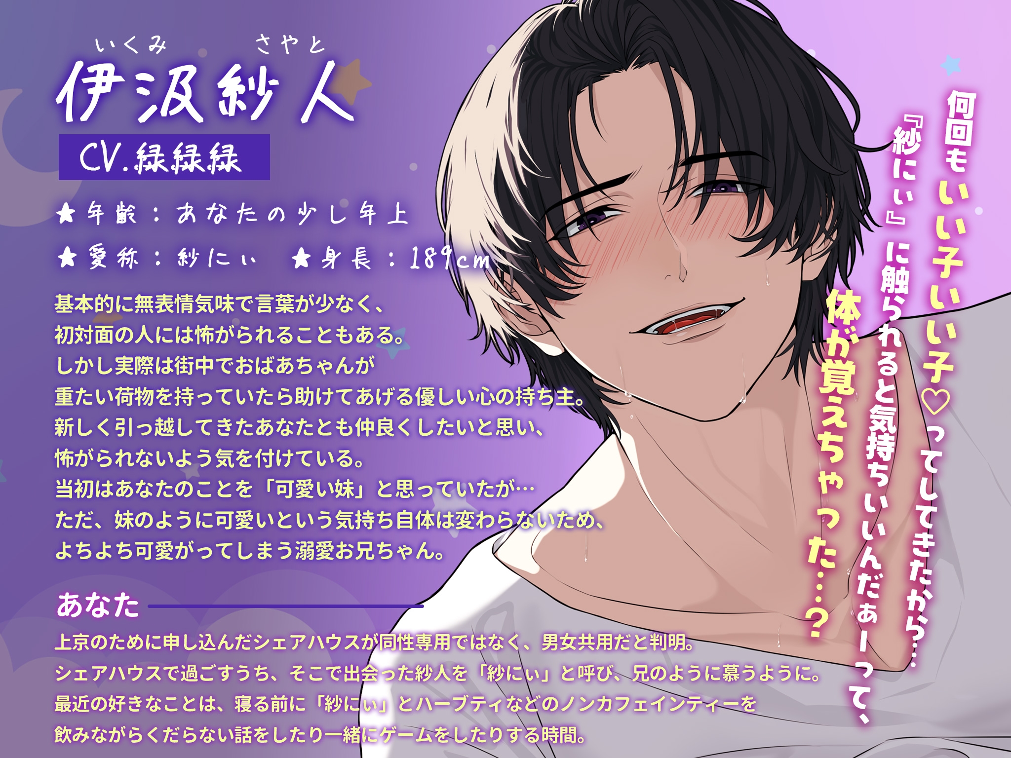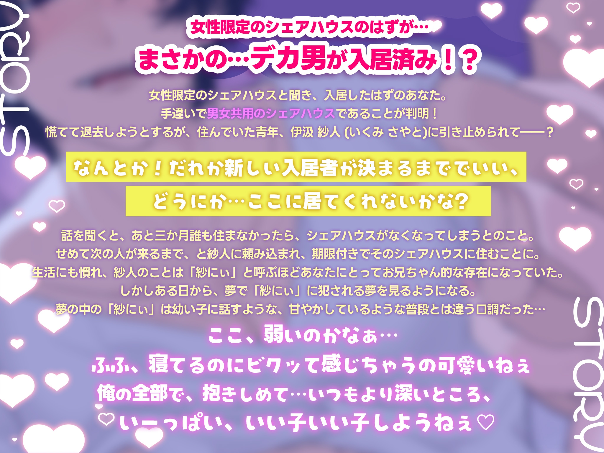 話を聞くと、あと三か月誰も住まなかったら、シェアハウスがなくなってしまうとのこと。せめて次の人が来るまで、と紗人に頼み込まれ、期限付きでそのシェアハウスに住むことに。生活にも慣れ、紗人のことは「紗にぃ」と呼ぶほどあなたにとってお兄ちゃん的な存在になっていた。しかしある日から、夢で「紗にぃ」に犯される夢を見るようになる。夢の中の「紗にぃ」は幼い子に話すような、甘やかしているような普段とは違う口調だった…