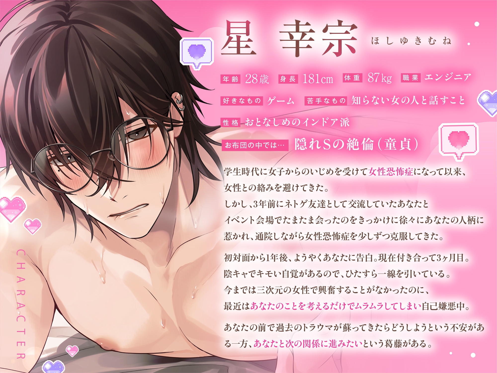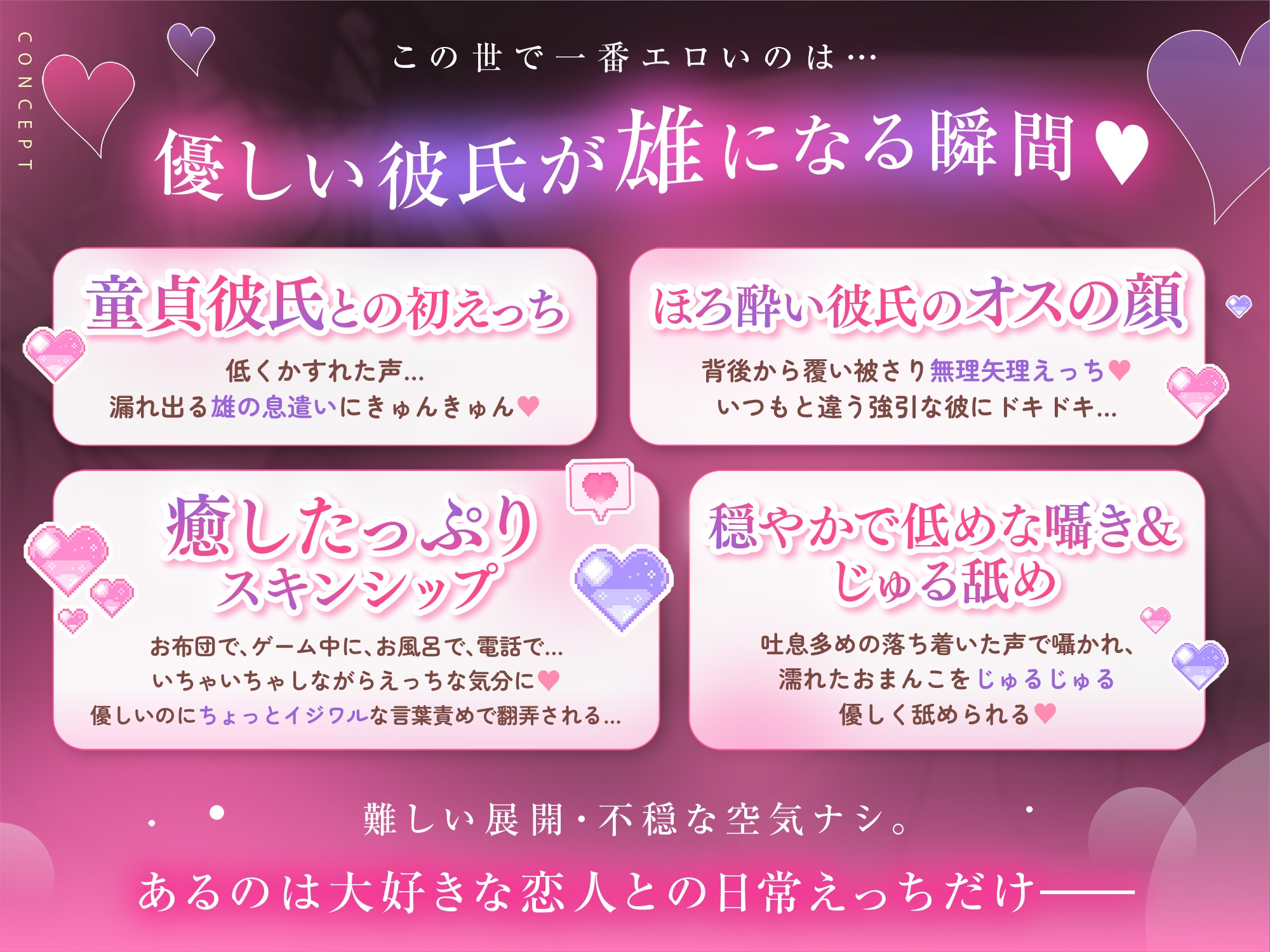リアルな童貞彼氏の息遣い、声の抑揚、台詞まわしにとことんこだわり、本当に彼が「いる」かのような日常えっちをお届け♡