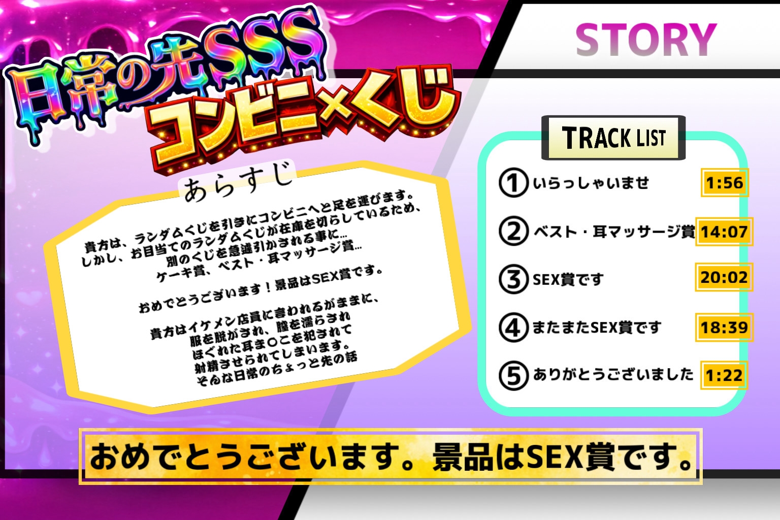![『おめでとうございます!』ランダムくじを引いたらSEX賞。イケメンコンビニ店員に流されて…くじの景品でSEXさせられちゃう話。 [秘密結社Simple・Sexy・Shock] 『おめでとうございます!』ランダムくじを引いたらSEX賞。イケメンコンビニ店員に流されて…くじの景品でSEXさせられちゃう話。 [秘密結社Simple・Sexy・Shock]](http://img.dlsite.jp/modpub/images2/parts/RJ01587000/RJ01586670/86d15b2ab4ff0e8125a11ede4d7a17c0.jpg)