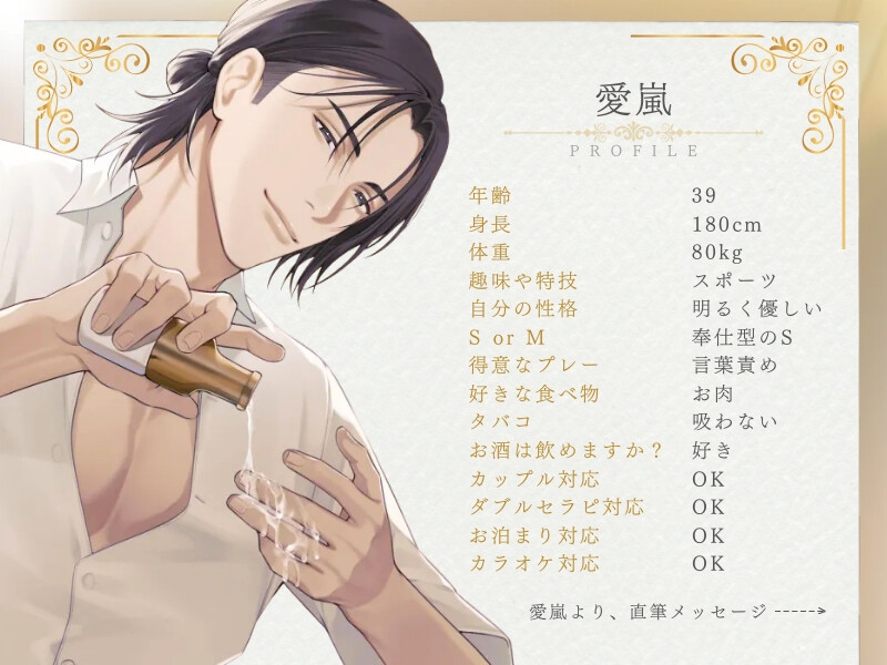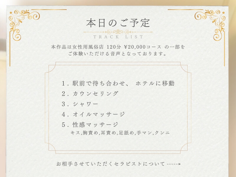 本作は、某女性用風俗店に所属の現役セラピスト・愛嵐(アラン)様にご出演いただいており、音声内の流れは全て、実際に行われているサービスと全く同じ内容となっています