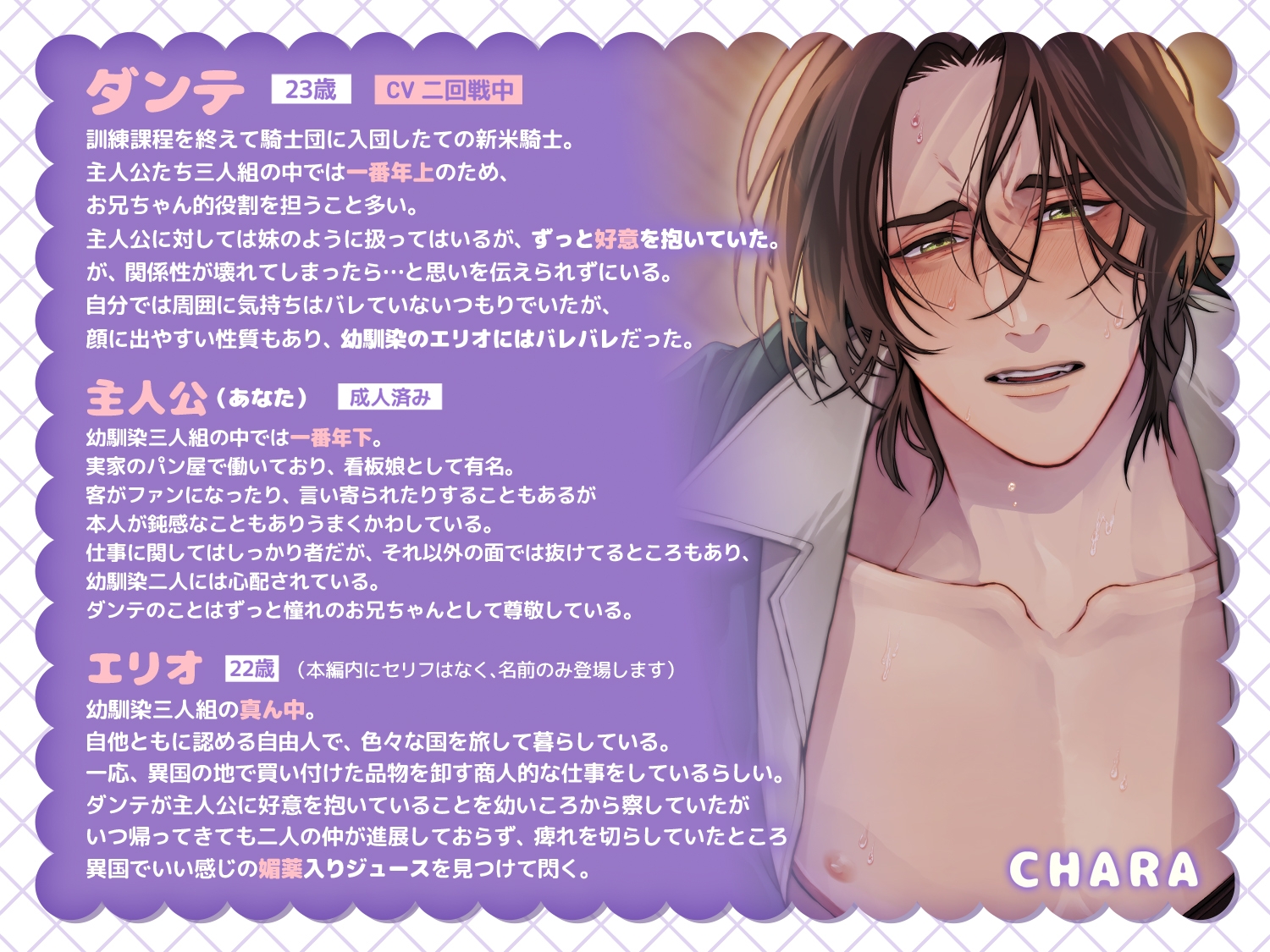 騎士団任務のためしばらく遠征となるダンテは成り行きで恋人となっていた主人公に改めて、しっかりと想いを伝えて……