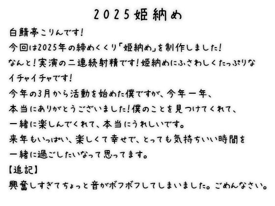 【本当に連続射精してます】白鯖亭姫納め2025!今年最後のえっちは貪り合う連続中出しえっちで姫納めしちゃお!【実演リアル連続射精】