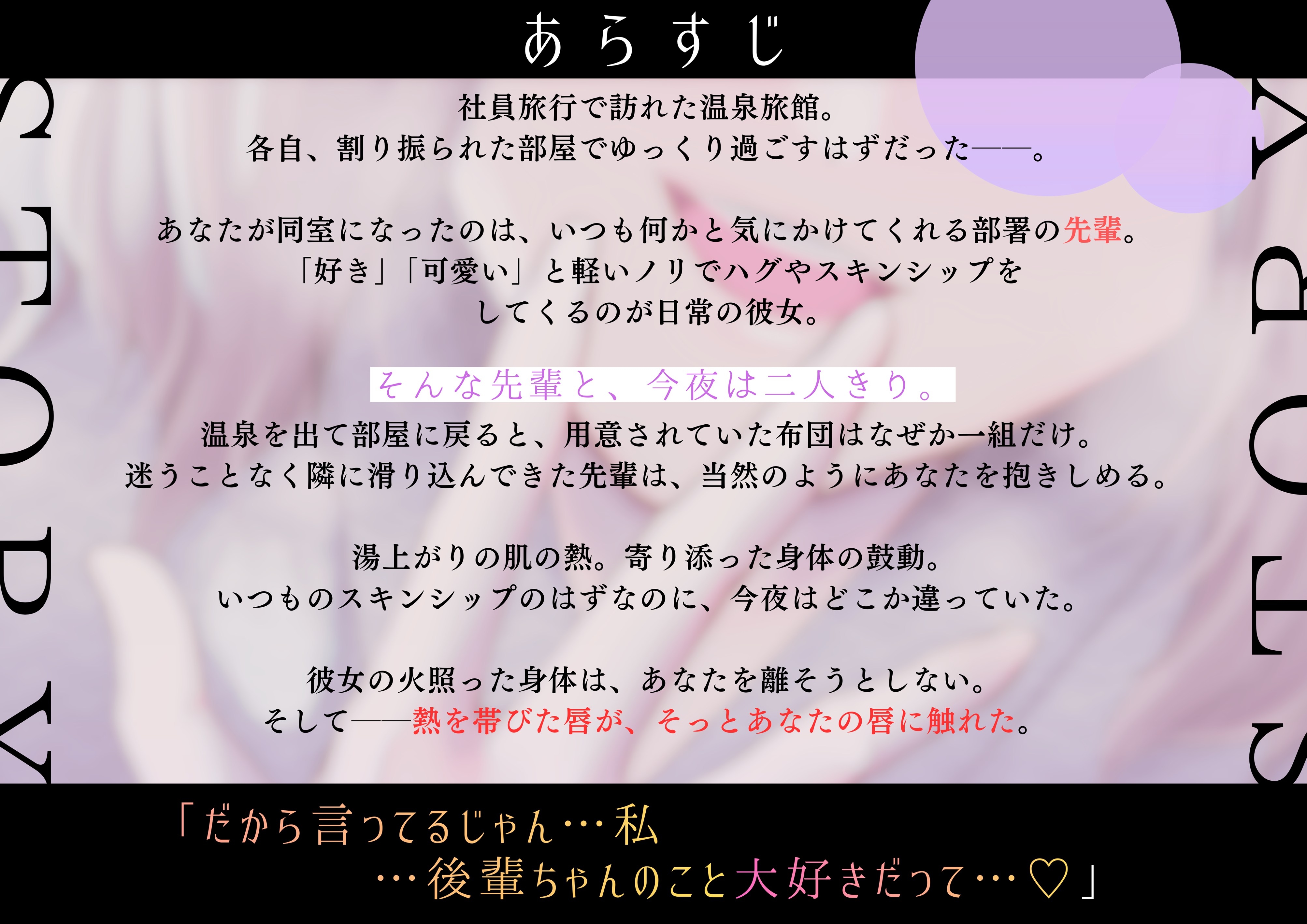![【百合】社員旅行で溺愛先輩に堕とされる夜【シナリオレス×全編アドリブ作品】 [桃色のぱらどっくす] 【百合】社員旅行で溺愛先輩に堕とされる夜【シナリオレス×全編アドリブ作品】 [桃色のぱらどっくす]](http://img.dlsite.jp/modpub/images2/parts/RJ01582000/RJ01581747/54edfdd1b6c2d46dc8ef631090027e3c.jpg)