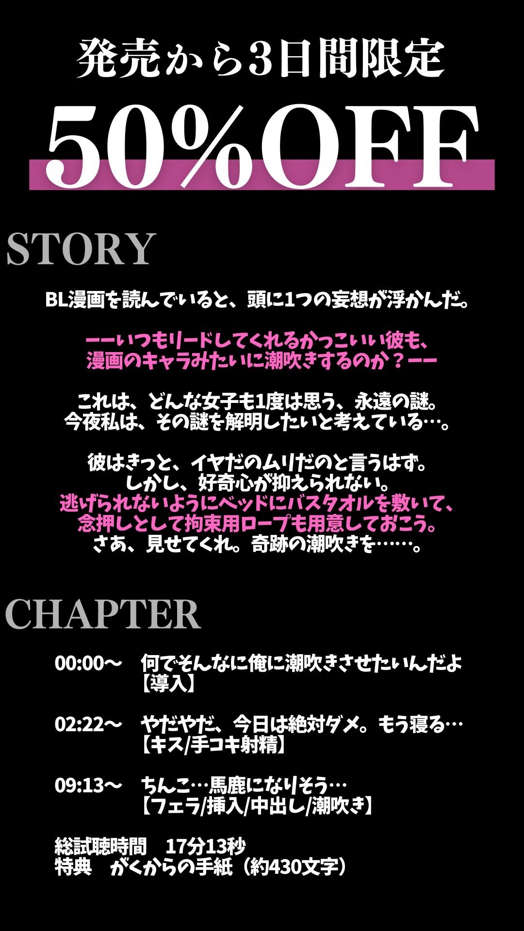 【3日間限定半額】ムリムリ言いながら潮吹き射精に付き合ってくれる塩系彼氏〜イキまくり!喘ぎまくり!吹きまくり!〜(CV:がく×シナリオ:咲夜)