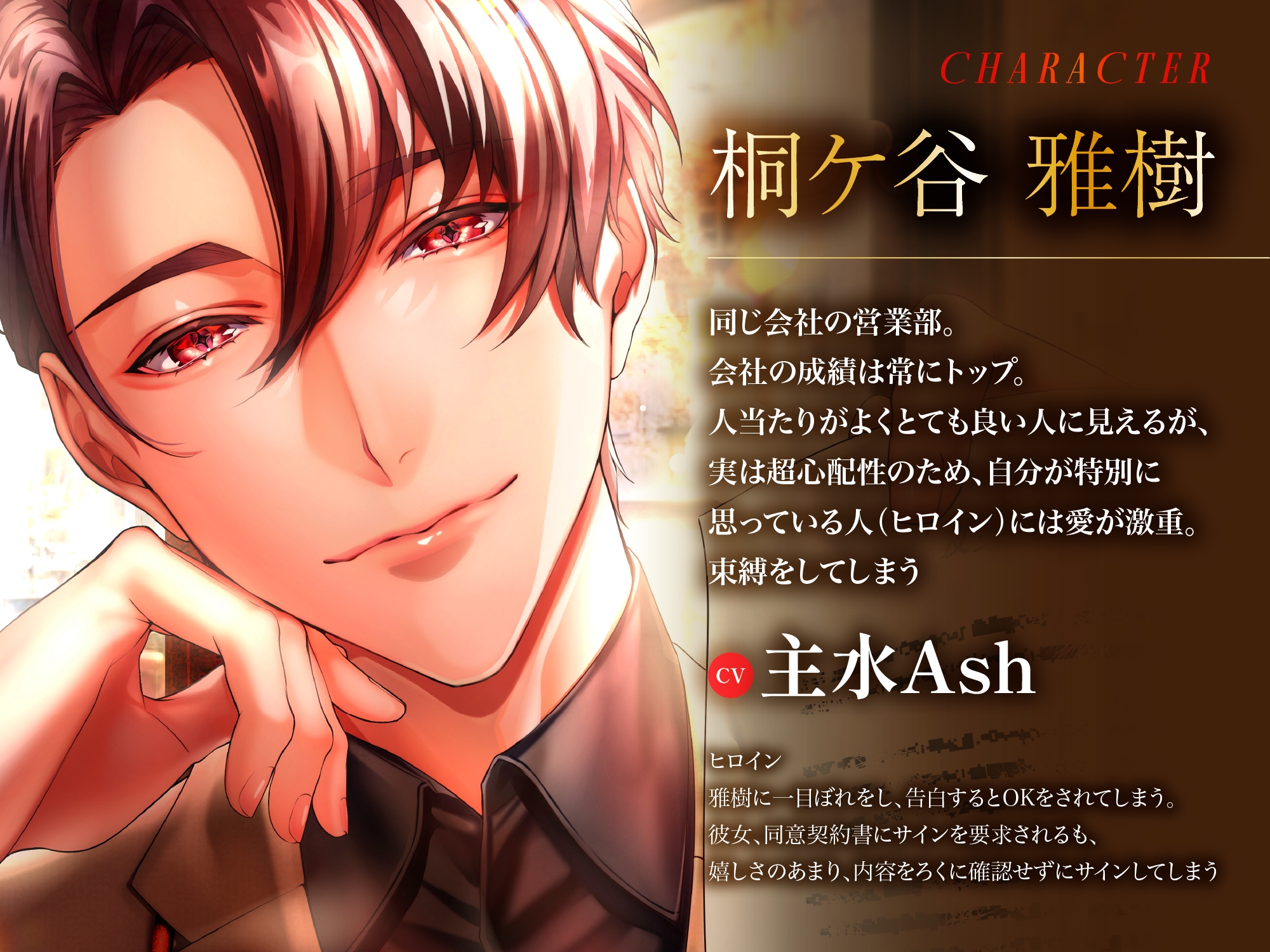 【同じ会社の営業部。会社の成績は常にトップ。人当たりがよくとても良い人に見えるが、実は超心配性のため、自分が特別に思っている人(ヒロイン)には愛が激重。束縛をしてしまう】