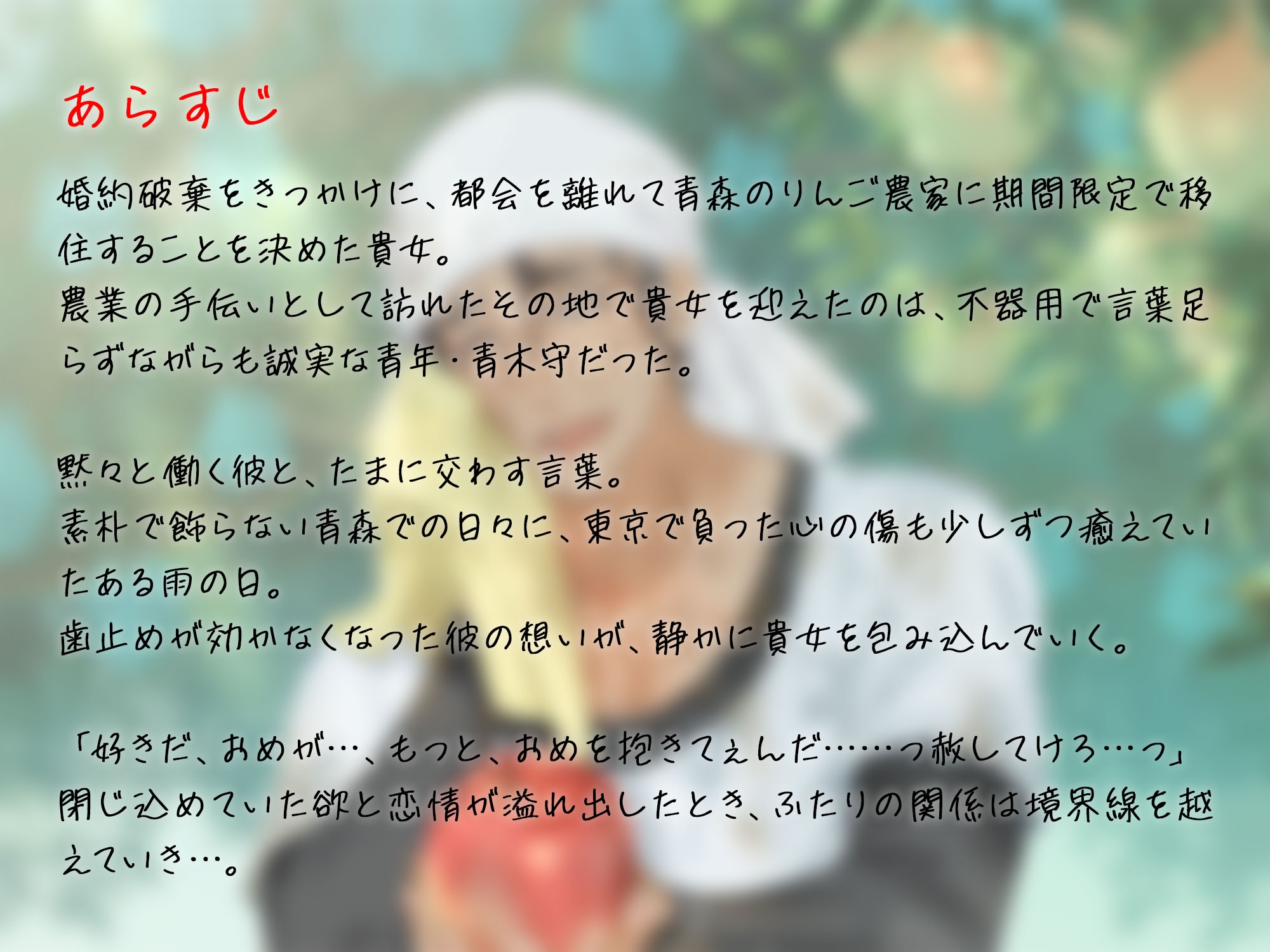 農作業の休憩中に2人並んで林檎の木陰に肩を並べて座り、手渡された林檎を食べながら少し饒舌に林檎について語る青木との縮んだ距離感を心地良さを感じていた貴女。