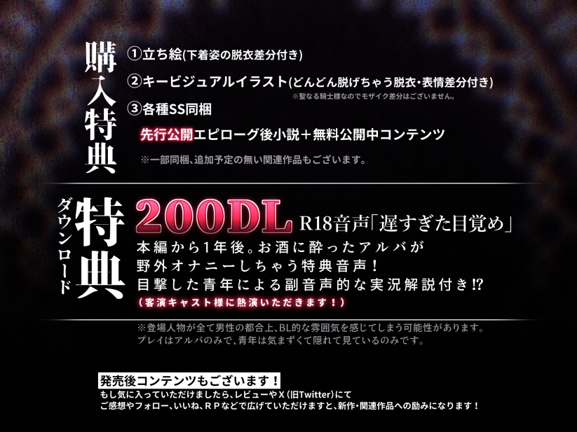 本編から1年後。お酒に酔ったアルバが野外オナニーをしてしまう特典音声です。