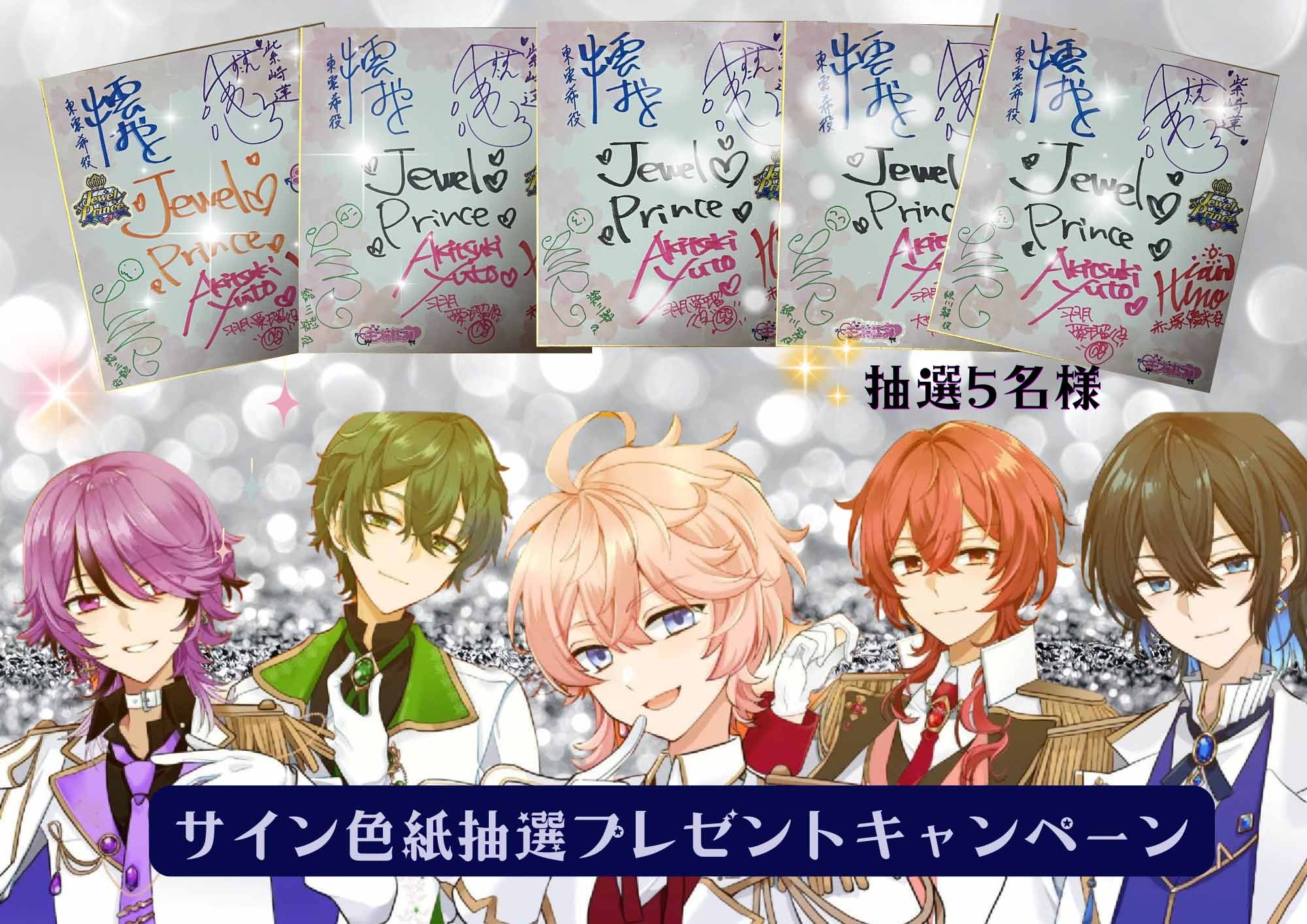 Jewel×Princeリリースを記念して、メンバーの声優様(雨色オニオン様、刺草ネトル様、秋月勇人様、日乃ひかり様、出雲颯人様)によるサイン色紙を抽選5名様へプレゼントいたします!!